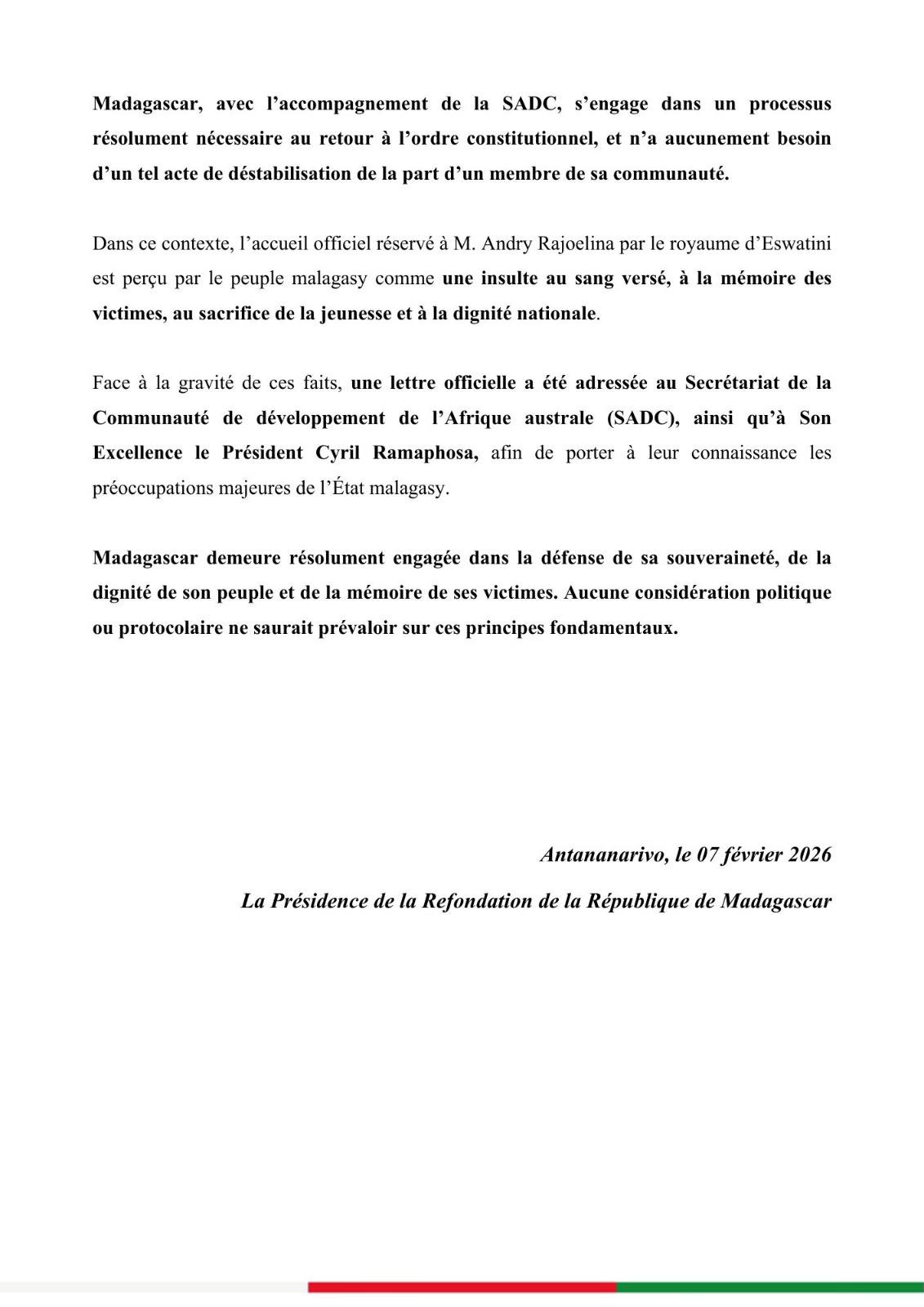 Condamnation ferme de l'accueil officiel accordé à M. Andry Rajoelina par le Royaume d'Eswatini