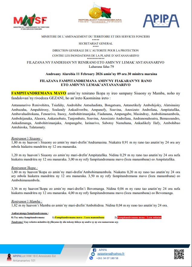 🟡 Fampitandremana mavo amin’ny renirano Ikopa sy ireo sampany Sisaony sy Mamba, noho ny fandalovan’ny rivodoza GEZANI, ho an’ireto Kaominina ireto: