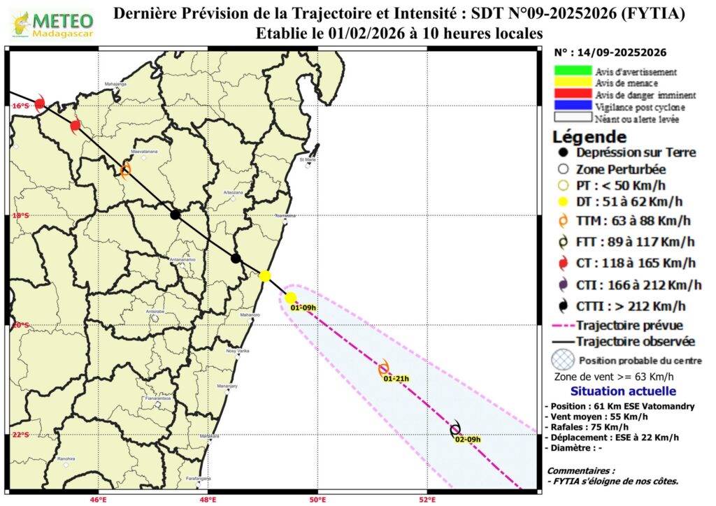 Tamin’ny 09 ora maraina teo dia tany amin’ny 61 km atsinanana somary atsimo atsinanan’i Vatomandry no nisy ny foiben’ilay andro ratsy FYTIA. 55 km/ora ny rivotra miaraka aminy izay arahina tafiotra 75 km/ora indraindray.