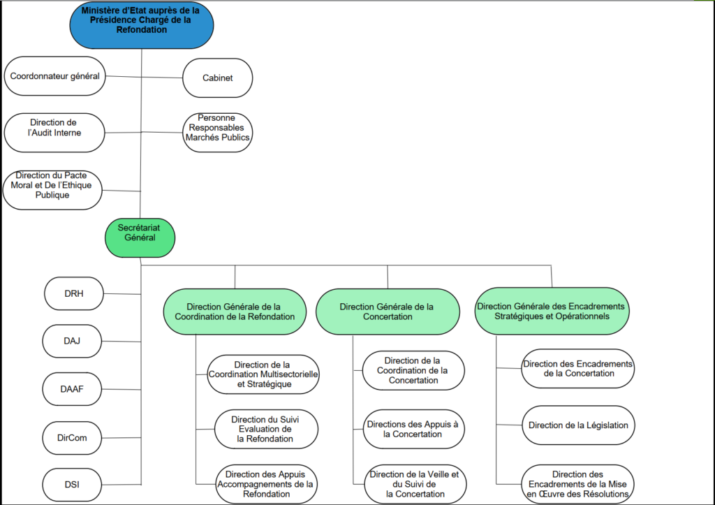 La Direction Générale de la Coordination de la Refondation a pour mission de coordonner et assurer la synergie entre les acteurs sectoriels, institutionnels et Organisations de la Société Civile afin de collecter les orientations stratégiques sectorielles pouvant étayer la Refondation à entreprendre. Ces orientations seront également incluses dans le document d’orientation de la Refondation républicaine fondée sur la justice, la dignité, la transparence, la redevabilité et la responsabilité. Elle agit en rôle de conseil et d’accompagnement, pour la mise en place des nouvelles Institutions, des nouvelles politiques et stratégies nationales sectorielles ainsi que l’organisation des élections de sortie de crise pour l’avènement de la cinquième République.